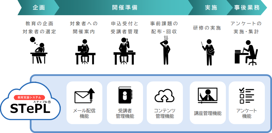 それぞれの場面に応じてステップの機能が研修企画担当者の業務をサポートします。