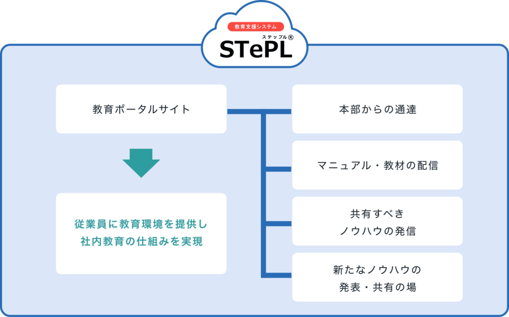 「STePL(ステップル)」とは、自己学習と情報共有の学習環境を構築し、研修業務の効率化をサポートするクラウド型の教育支援システムです。