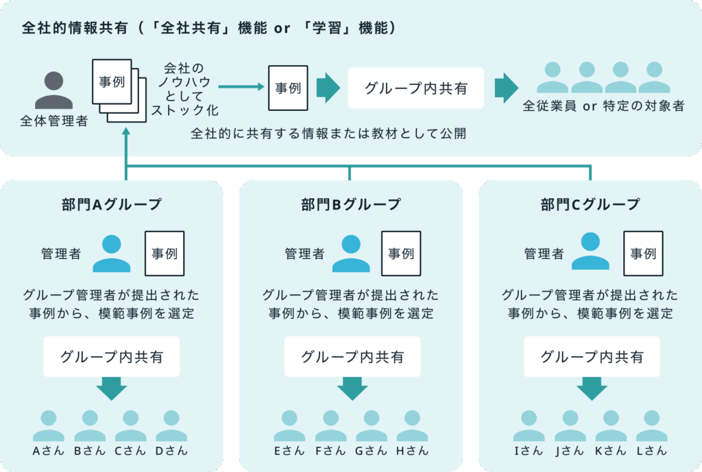 STePLの【グループ機能】と【全社共有】機能を使い現場のノウハウや情報を共有することができます。グループ内で共有した情報・ノウハウは、グループを問わず全社的に展開することができます。また、特定の対象者に展開することもできます。