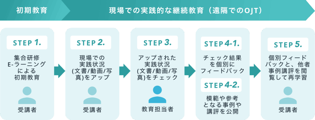 初期教育後の現場での継続教育の場面では、STePLを活用して、現場での実践状況を写真や動画などで提出させます。その後、各メンバーから提出された実践状況に対して、管理者や他メンバーがフィードバックをします。