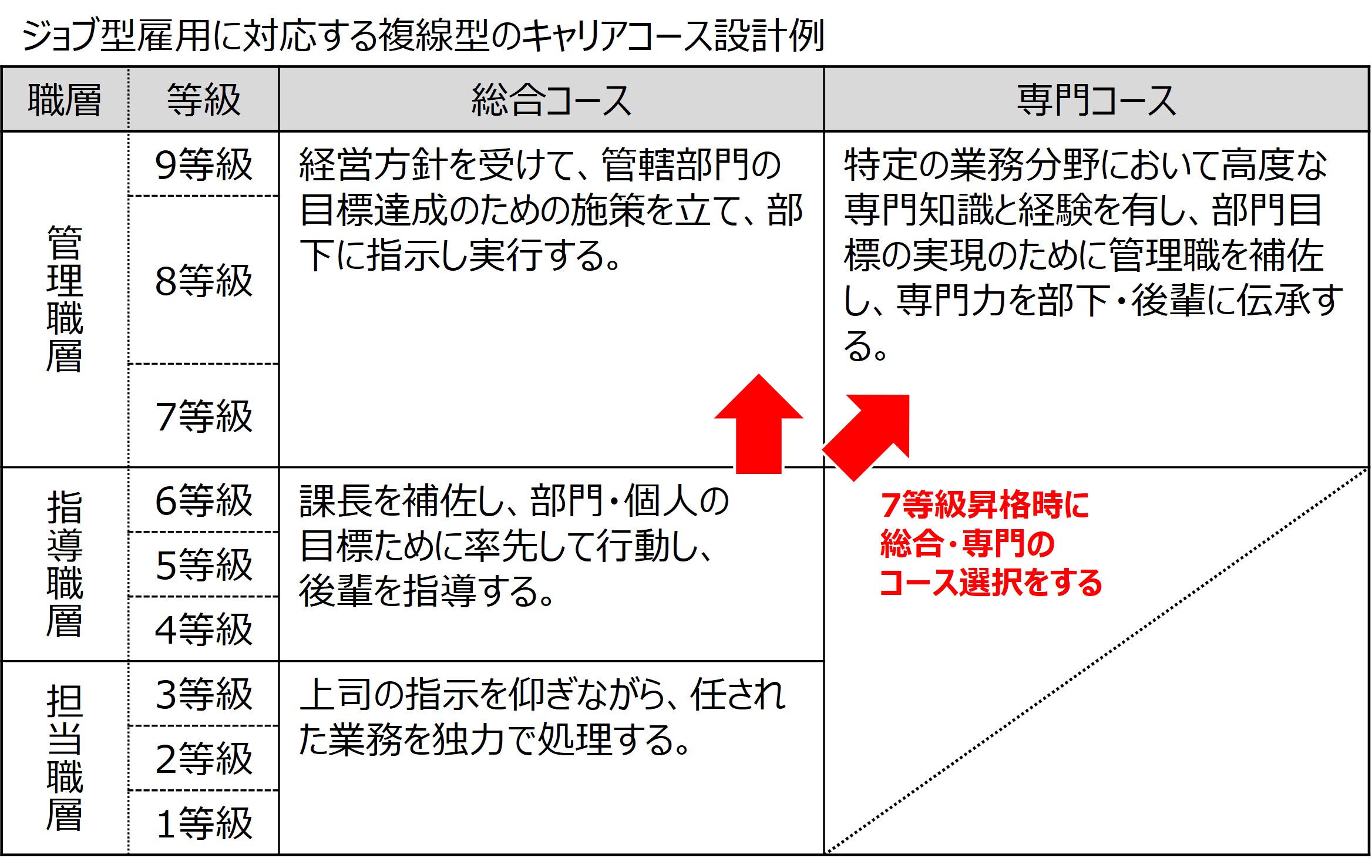 専門分野に特化したジョブを追求する道も選択できる、複線型の等級制度を設計します。